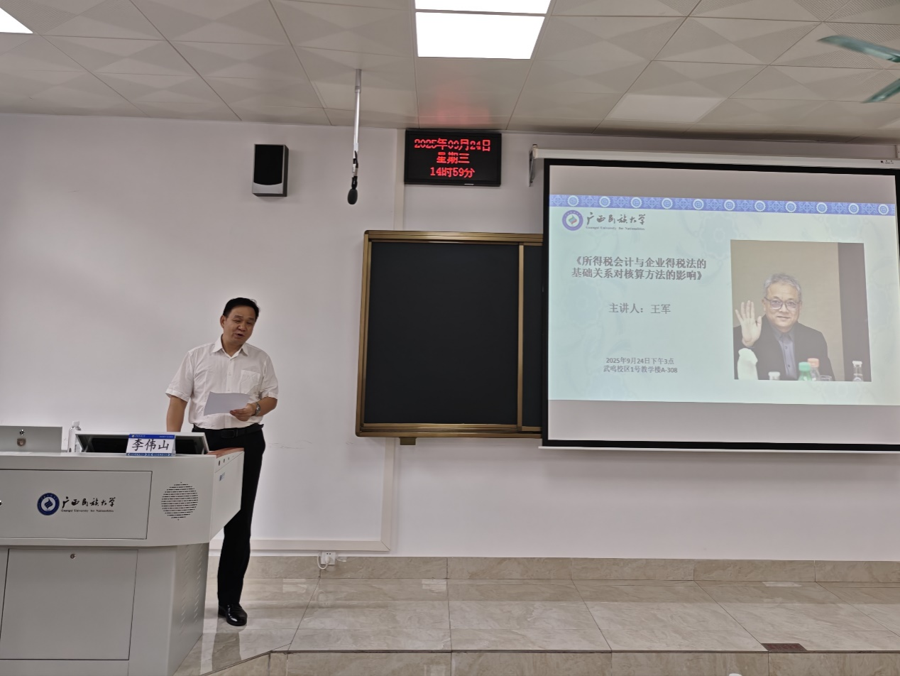 9月24日下午,应我院邀请,北京市国首律师事务所律师、注册会计师、注册资产评估师、注册税务师,中国注册会计师协会法律与权益维护委员会委员、北京注册会计师协会维权委员会委员、北京市律师协会财务委员会副主任、中国会计学会会员、中国政法大学法律硕士学院兼职导师王军老师在我校武鸣校区1号教学楼A-308教室为师生作了《所得税会计与企业所得税法的基础关系对核算方法的影响》的主题讲座。此次讲座由fun88乐天使李伟山副院长主持,fun88乐天使部分教师及会计学专业的研究生参加本次讲座。